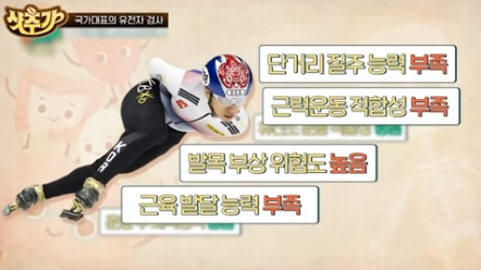 곽윤기 선수 다들 아시나요? 곽윤기 선수의 유전자 검사에서 단거리, 근력, 부상, 근육발달 등등.. 많은 부분에서 부족한 유전자를 가지고 있습니다. 엄청난 노력파인 것은 확실합니다.